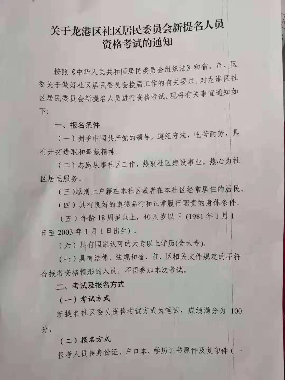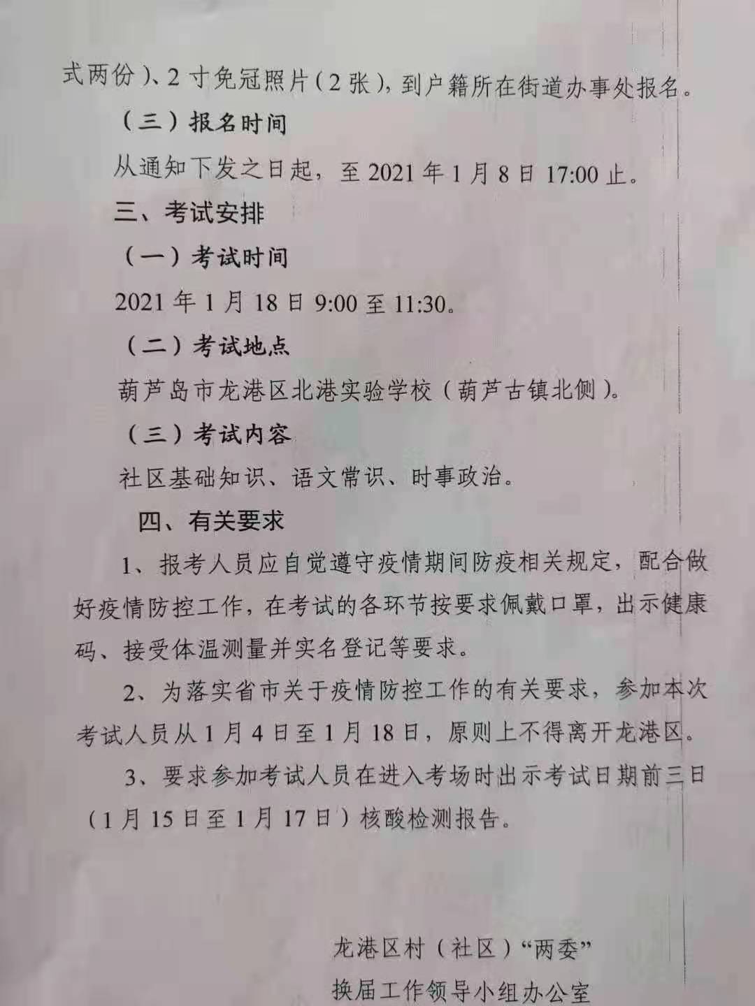 葫芦岛龙港区社区居民委员会新提名人员资格考试的通知