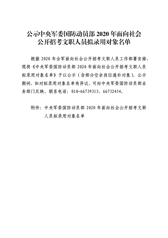 公示中央军委国防动员部2020年招考文职人员拟录用对象名单