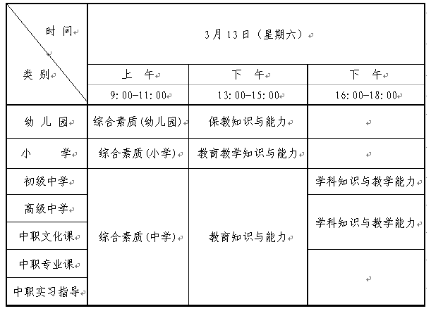 全国中小学教师资格考试(笔试)日期为2021年3月13日,具体时间安排如下: