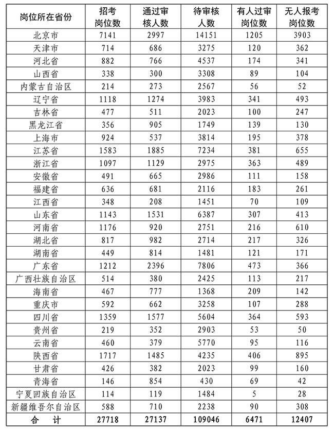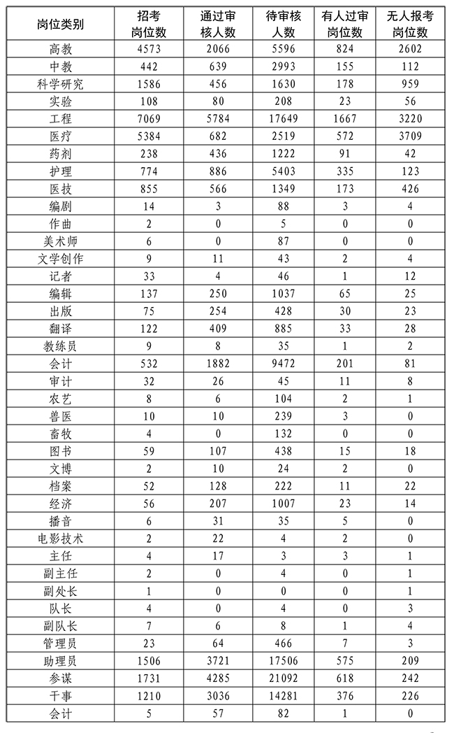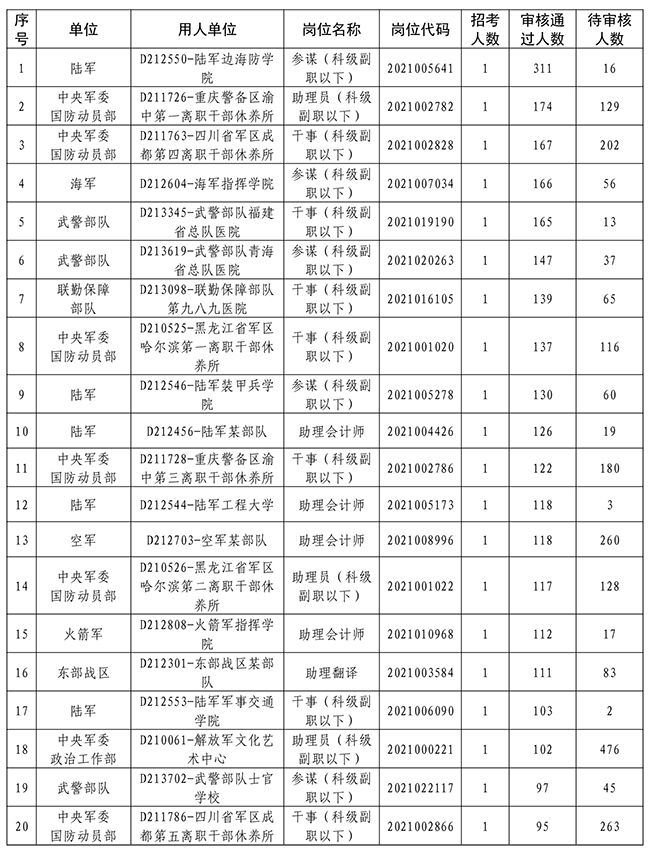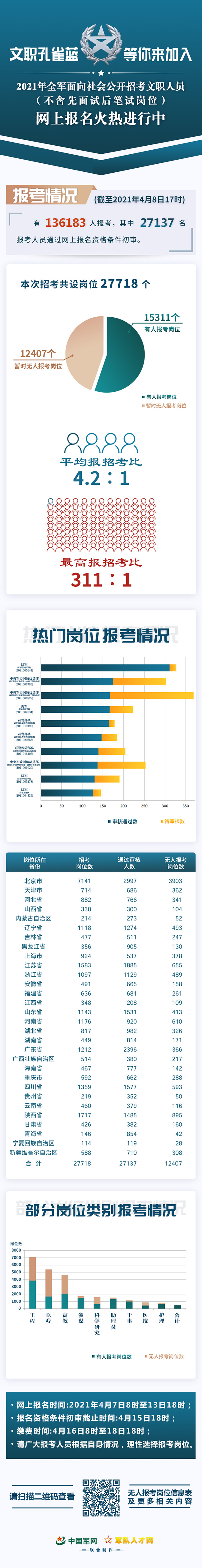 2021年全军面向社会公开招考文职人员(不含先面试后笔试岗位)网上报名于4月7日8时正式开通。截至4月8日17时,有136183人报考,其中27137名报考人员通过网上报名资格条件初审。15311个岗位有人报考,12407个岗位暂时无人报考。此次招考网上报名时间为2021年4月7日8:00至13日18:00,报名资格条件初审截止时间为4月15日18:00,缴费时间为4月16日8:00至18日18:00。请广大报考人员理性选择报考岗位,抓紧时间提交审核,并及时关注审核结果。相关岗位报考情况如下: