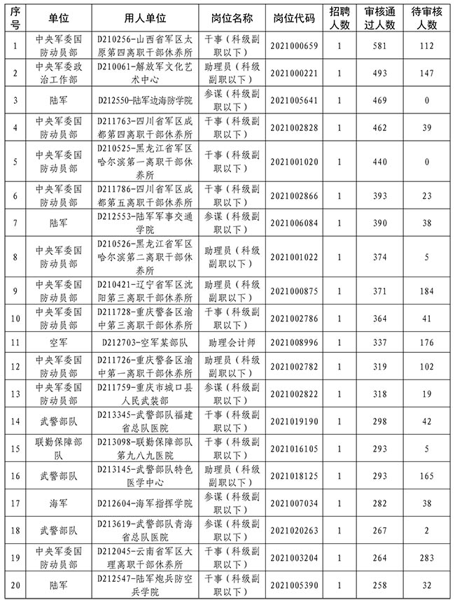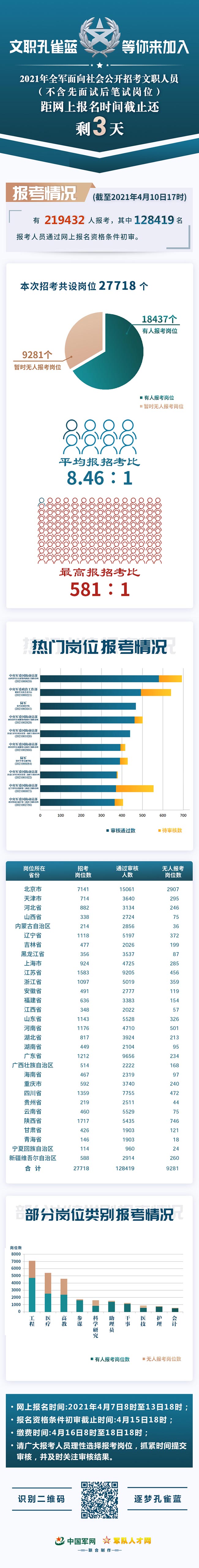 2021年全军面向社会公开招考文职人员(不含先面试后笔试岗位)网上报名于4月7日8时正式开通。截至4月10日17时,有219432人报考,其中128419名报考人员通过网上报名资格条件初审,平均报招考比为8.46∶1,最高报招考比为581∶1。有人报考的岗位18437个,岗暂时无人报考的岗位9281个。请广大报考人员理性选择报考岗位,抓紧时间提交审核,并及时关注审核结果。相关岗位报考情况如下: