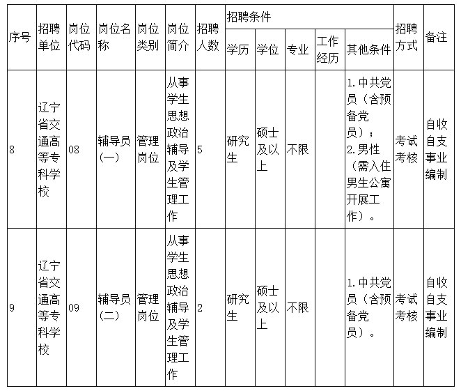 《辽宁省交通高等专科学校2021年面向社会公开招聘工作人员公告》中,附件《2021年辽宁省交通高等专科学校面向社会公开招聘工作人员员计划信息表》中序号为8、9的岗位现做如下修改: