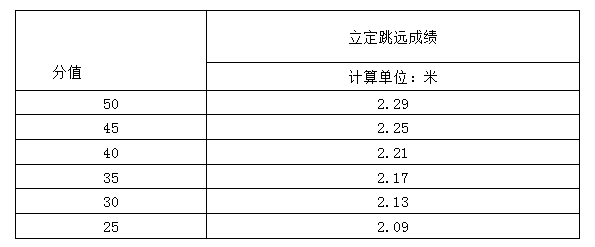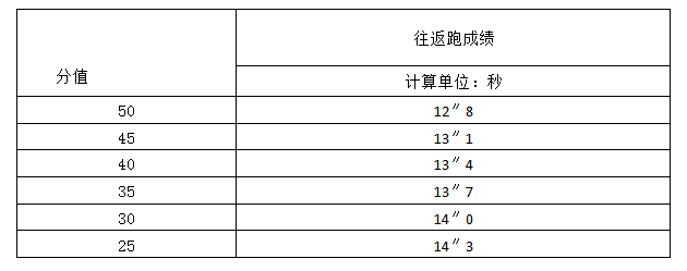 体能测试项目为立定跳远、10米×4往返跑,满分100分,占总成绩的50%。体能测试标准为: