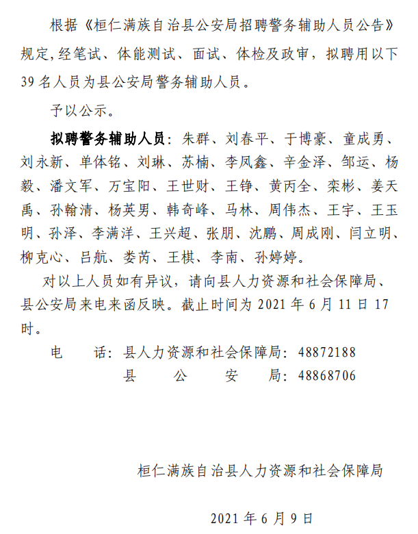 2021年本溪市桓仁满族自治县招聘警务辅助人员拟聘人员公示