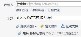 2.报名方式:如图所示,考生将相关所有报名材料压缩成ZIP或RAR格式,以附件的形式发送到jydrhr@126.com邮箱,邮件主题格式为“姓名 身份证号码 报名材料”。