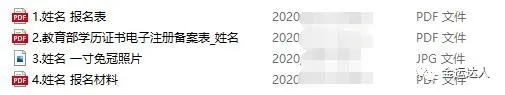 考生发送的压缩文件中,按图示要求命名文件,将所需报名材料(1)、(2)分别生成PDF文件;(3)存为JPG文件;(4)、(5)、(6)、(7)、(8)按序扫描生成一份PDF文件。