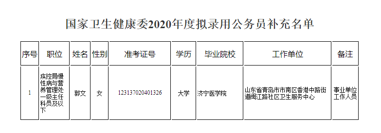 在2020年度中央机关及其直属机构考试录用公务员工作中,郭文同志经过笔试、面试进入体检环节,由于其处于孕期无法体检,按照有关规定待孕期结束进行后续程序。现经体检、考察等程序确定郭文同志为国家卫生健康委拟录用公务员,予以公示。公示期间如有问题,请向国家卫生健康委人事司反映。