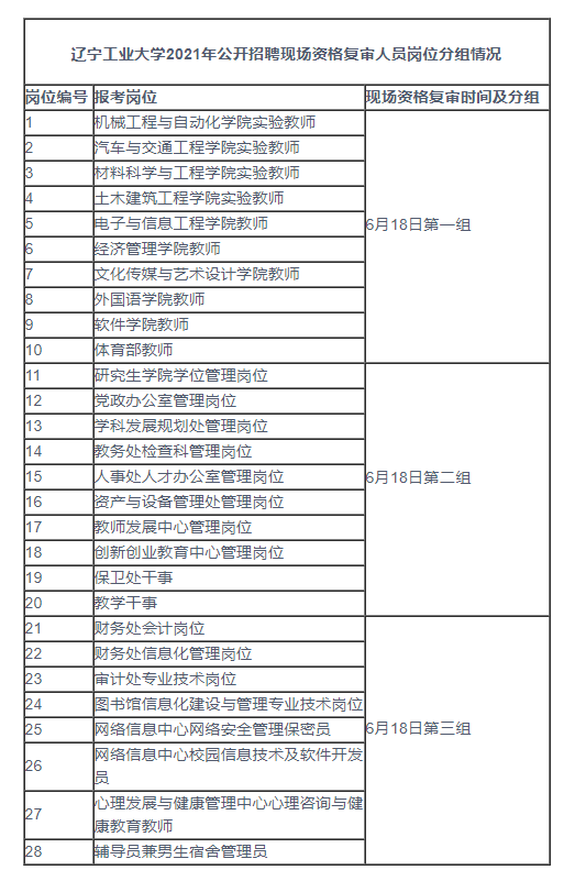现场资格复审将于6月18日进行,详情见下表《辽宁工业大学2021年公开招聘现场资格复审人员岗位分组情况》