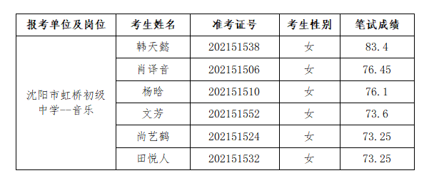皇姑区2021年公开招聘聘用合同制教师面试人员名单已于2021年6月15日发布,因信息统计错误,现将“沈阳市虹桥初级中学--音乐”岗位进入面试人员名单更正如下: