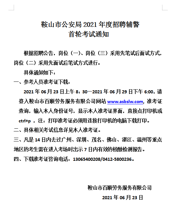 鞍山市公安局2021年度招聘辅警首轮考试通知