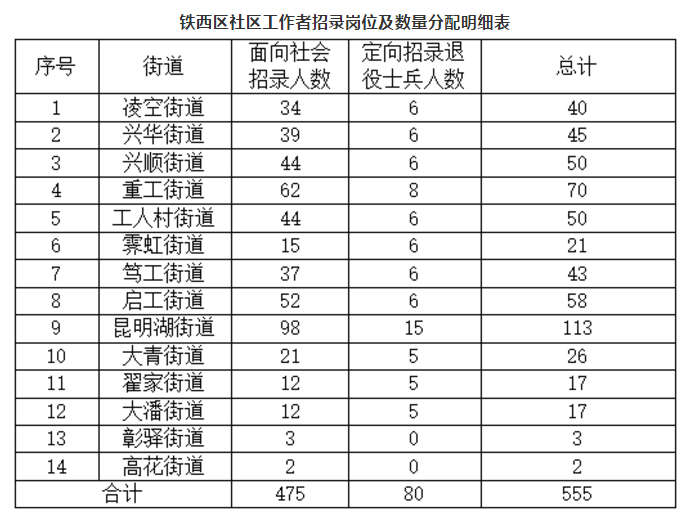 本次招录共计555人(含定向招录退役士兵80人),面向14个街道140个社区。