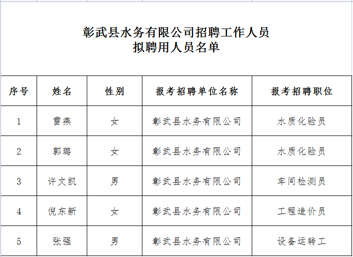 附件:彰武县水务有限公司公开招聘工作人员拟聘用人员名单