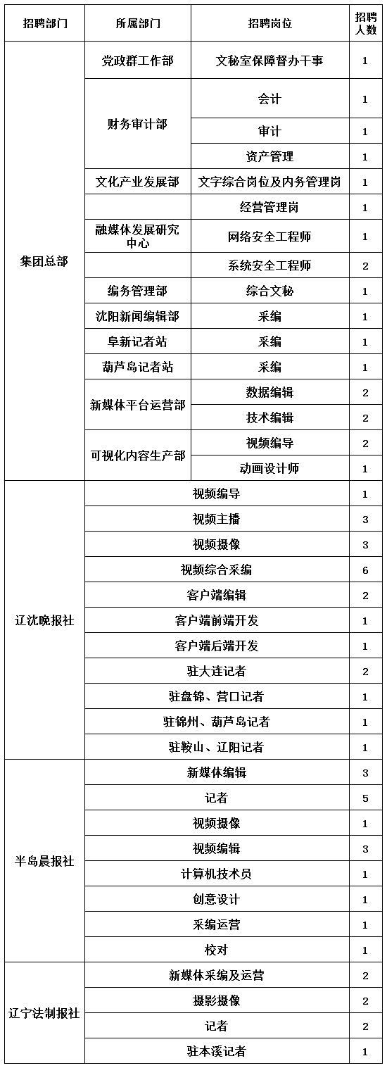 辽宁报刊传媒集团(辽宁日报社)面向社会公开招聘65名劳动合同制工作人员,现将有关事项公告如下。