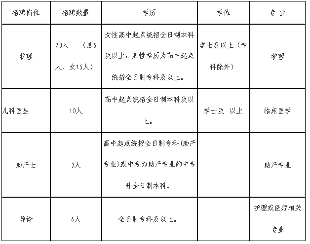 6.儿科医生岗位:2017年(含)以后毕业生,高中起点统招全日制本科及以上学历,需具有医师资格证和医师执业证(2020年和2021年毕业生除外)。