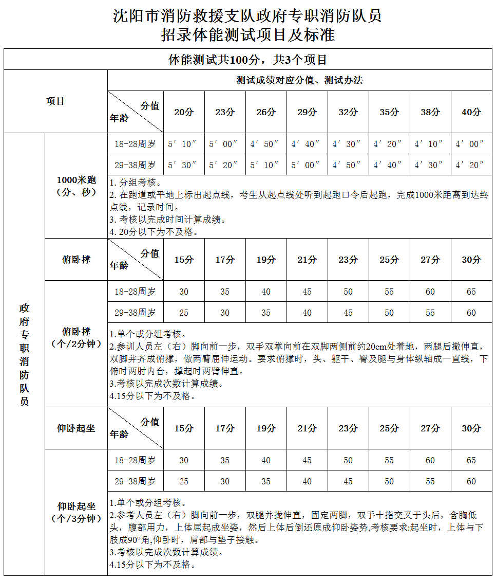 考试为综合素质测试,采取体能测试和面试相结合的方式进行,总分300分。按体能测试100分、面试占100分和笔试100分计算考试最终成绩; 体能考核三个项目必须达标方可进入面试考试环节,体能考核成绩、面试成绩当场公布,如有疑问,现场申诉,超过考核时限当弃权处理。