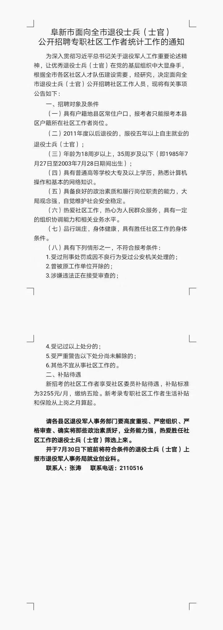 2021年阜新市面向全市退役士兵(士官)招聘专职社区工作者统计工作的通知