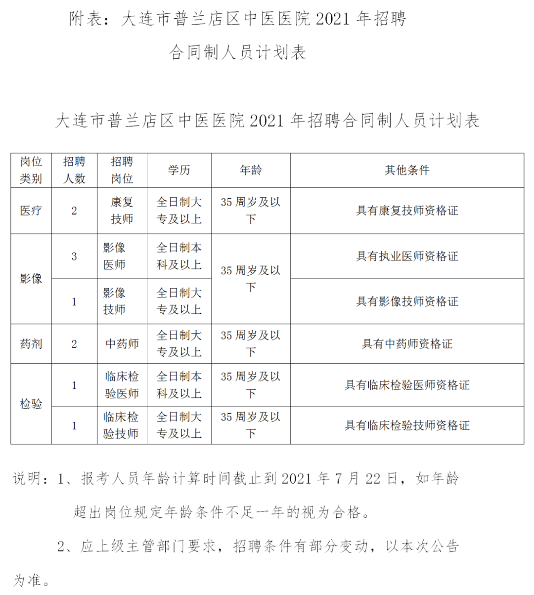 (六)具有岗位所需要的其他条件(详见《大连市普兰店区中医医院2021年招聘合同制人员计划表》)。