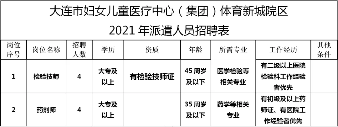 用工类型为派遣制人员,工作地点为大连市妇女儿童医疗中心(集团)体育新城院区。