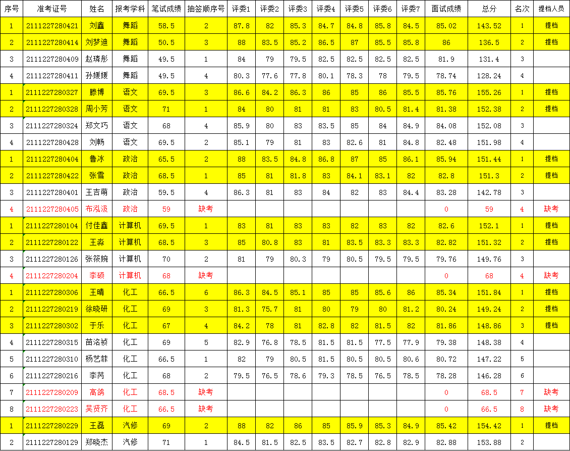 现将2021年盘山县职业教育中心公开招聘教师考试总成绩公示如下,并按照招聘的岗位数量标明提档人员。因时间紧迫,以免登分过程出现失误,若公布的成绩与考生在考场签字确认的成绩有误,请考生及时与我们联系。若提档人员弃权或人事档案逾期未到,则顺位补录。为方便考生及时办理后续相关手续,现将有关事宜通知如下: