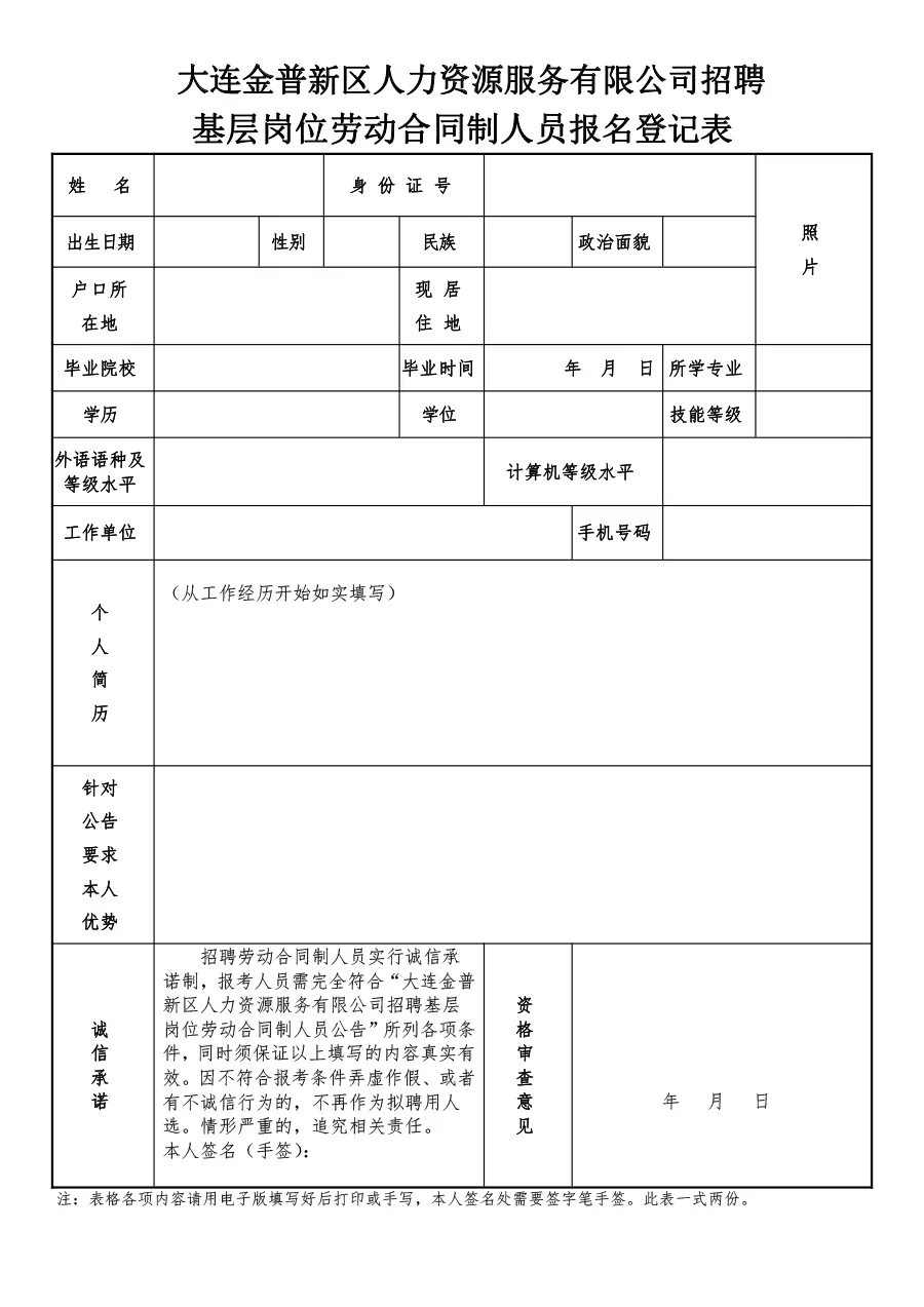 (1)《大连金普新区人力资源服务有限公司招聘基层岗位劳动合同制人员报名登记表》一式两份(贴好照片);