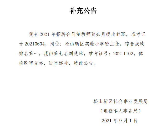 2021锦州市松山新区面向社会招聘合同制教师拟聘用人员名单(补充公告)