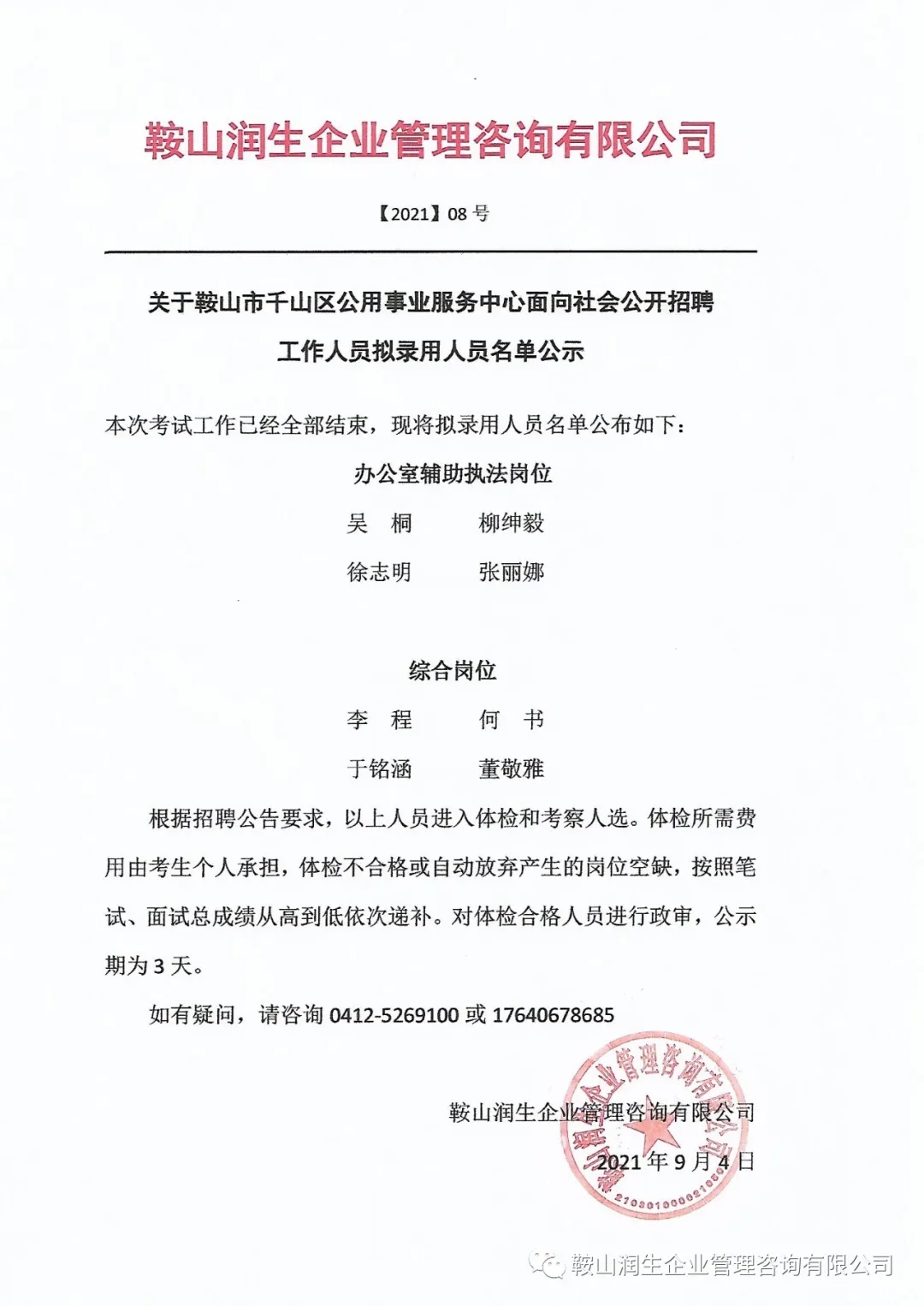 鞍山市千山区公用事业服务中心公开招聘工作人员考试总成绩公告