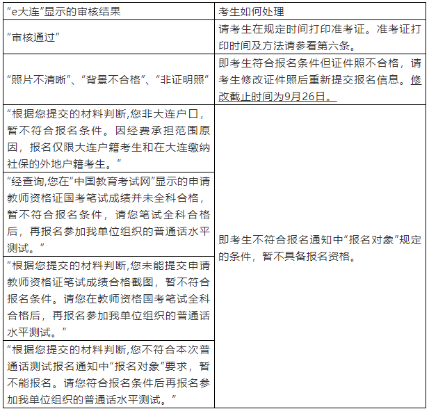 信息审核以网络审核方式进行,集中审核时间为9月25日,考生可在26日前通过“e大连”的“普通话水平测试报名”栏目中“查看报名记录”查询审核结果。