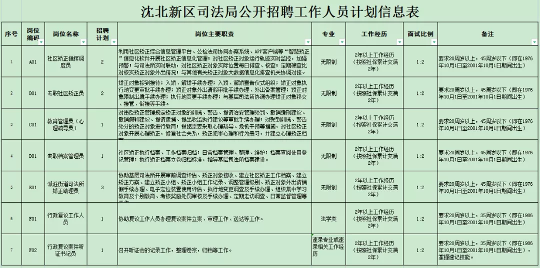 具体岗位包括:社区矫正指挥调度员2名;专职社区矫正员2名;社区矫正教育管理员(心理疏导员)1名;社区矫正专职档案管理员1名;派驻街道司法所社区矫正员3名;行政复议案件办理辅助人员1名;行政复议案件听证书记员1名。