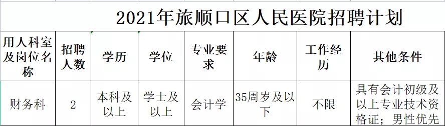 旅顺口区人民医院建院于1945年,是一所集医疗、教学、预防、康复于一体的三级综合医院,是全区人民的医疗中心、急救中心、体检中心。为了满足医院各学科的发展以及人才梯队建设,现面向社会公开招聘合同制财务工作人员2名。
