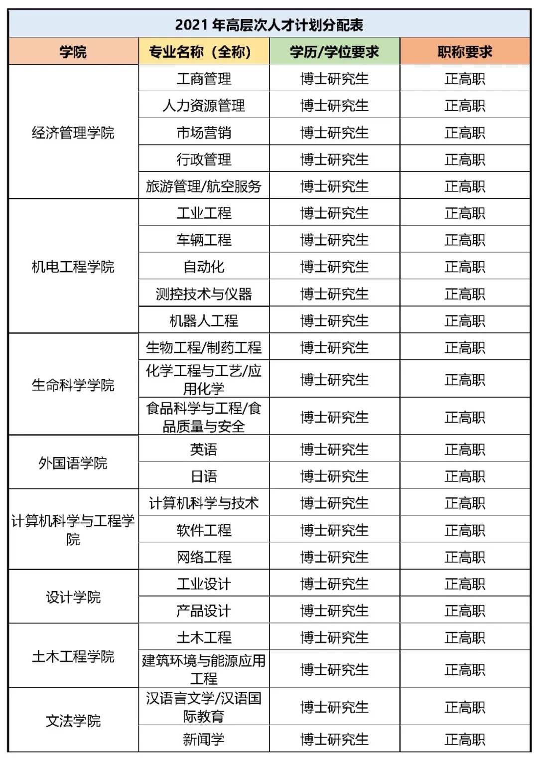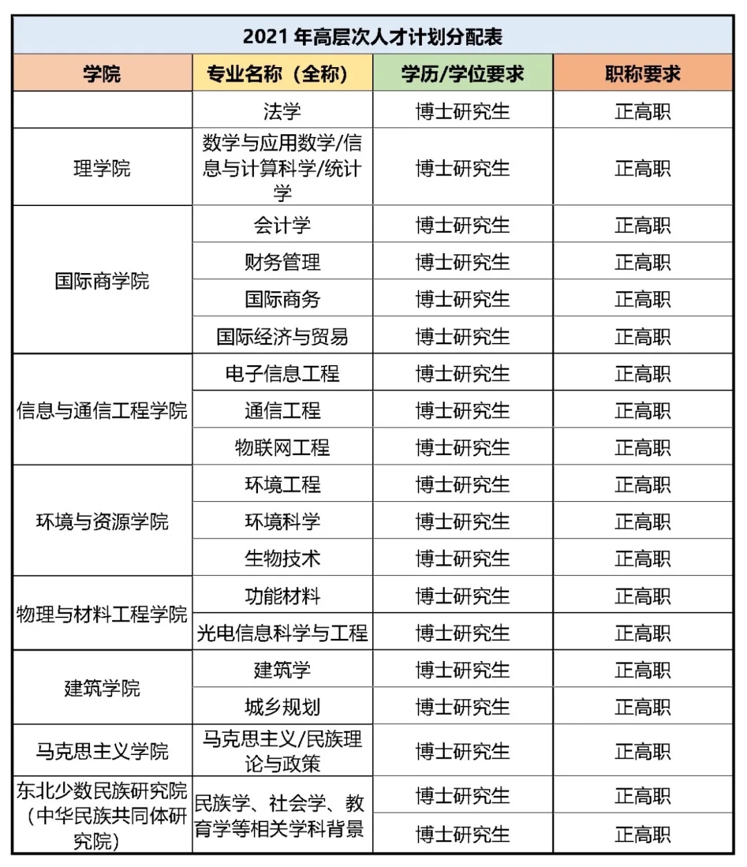 八、2021年高层次人才引进计划分配表学校高层次人才引进计划4人。应聘条件为正高职专业技术职称,由学校组织认定达到学校领军人才及以上学术(教学)水平,学科专业参照公开招聘计划表。