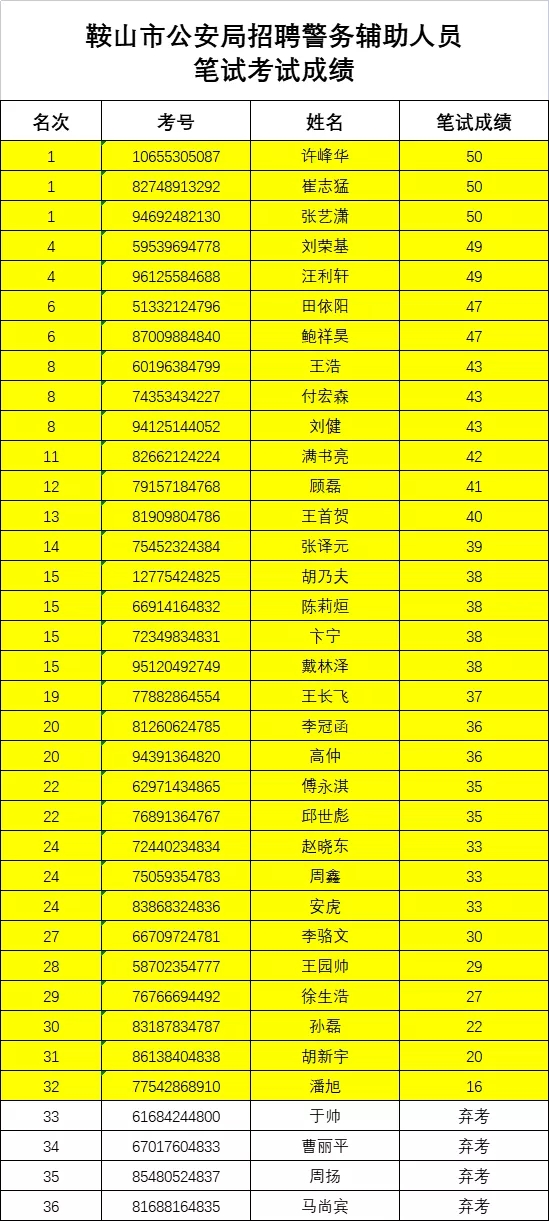 2021年鞍山市公安局招聘警务辅助人员笔试考试成绩