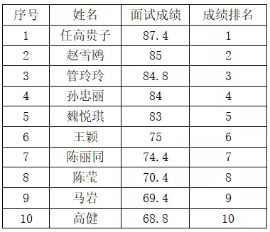 按照《鲅鱼圈劳动保障协理员招聘公益性岗位面试实施方案》要求,面试考核采取现场问答的方式,面试总分为100分,其中考生成绩各分项包括语言表达、举止仪表、组织协调能力等得分累计相加,由高分到低分择优录取,不及格者取消应聘资格。面试成绩前5名进入体检和政审。体检及政审不合格者不予录用。