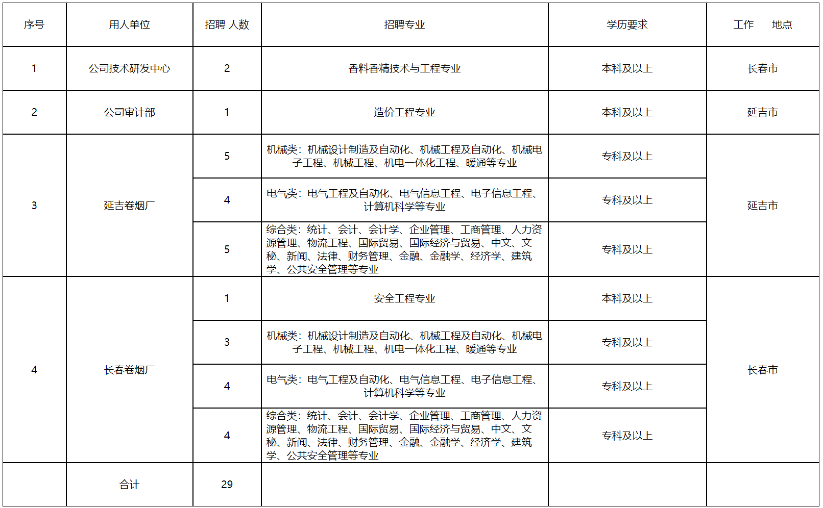 吉林烟草工业有限责任公司2021年应届高校毕业生招聘计划表