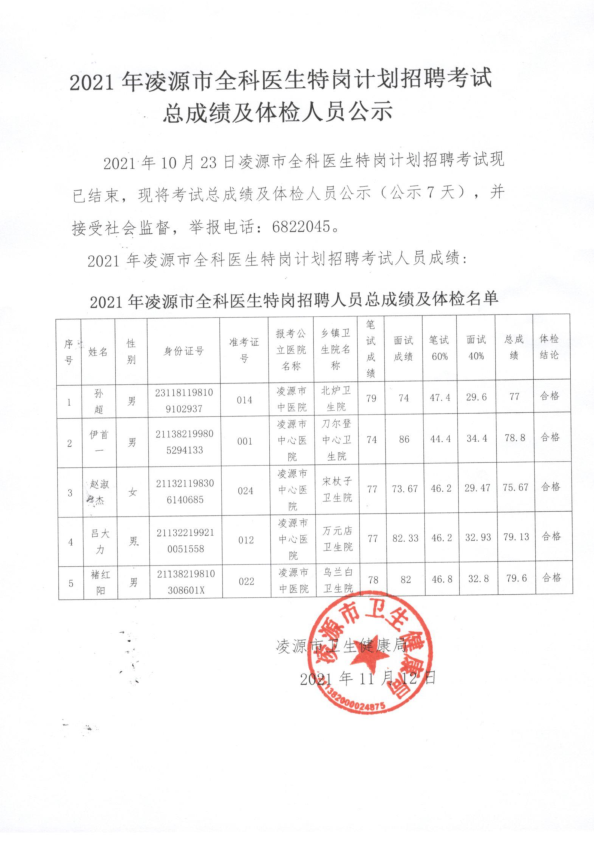 2021年凌源市全科医生特岗计划招聘考试总成绩及体检人员公示