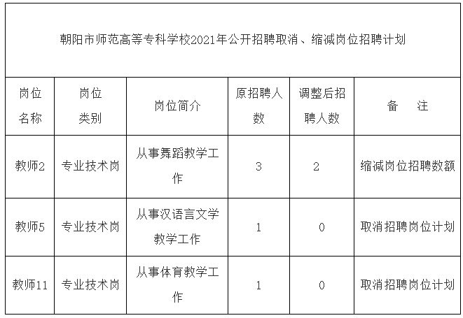 朝阳师范高等专科学校2021年公开招聘工作人员报名工作已经结束,其中教师2等3个岗位,因有效报名人数与招聘人数未达到2∶1比例,根据《朝阳师范高等专科学校2021年公开招聘工作人员公告》规定,将取消或缩减该岗位招聘计划,报考取消岗位招聘计划的考生可在11月24日11:30分前,改报其他符合条件的岗位。