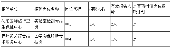 沈阳海关所属事业单位2021年面向社会公开招聘事业单位工作人员网上报名和资格审查工作已结束。截至报名截止时间,沈阳国际旅行卫生保健中心实验室检测专技岗和锦州海关综合技术服务中心医学影像诊断专技岗有效报名人数与招聘人数的比例未达到3:1,根据《沈阳海关所属事业单位2021年面向社会公开招聘事业单位工作人员公告》,将取消以上两个岗位招聘计划。现将有关信息公告如下: