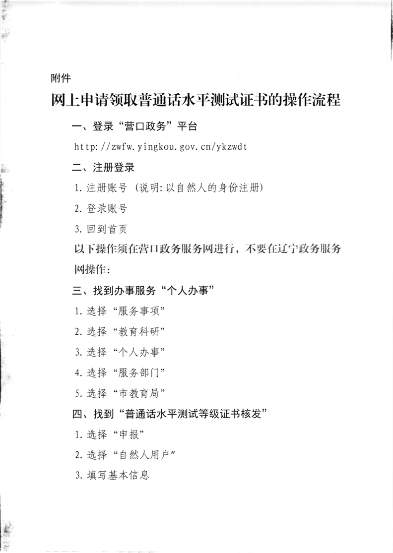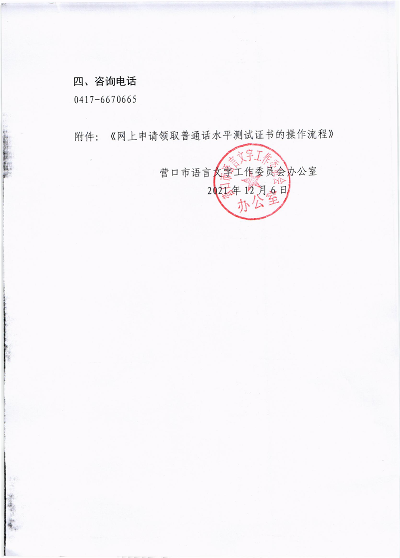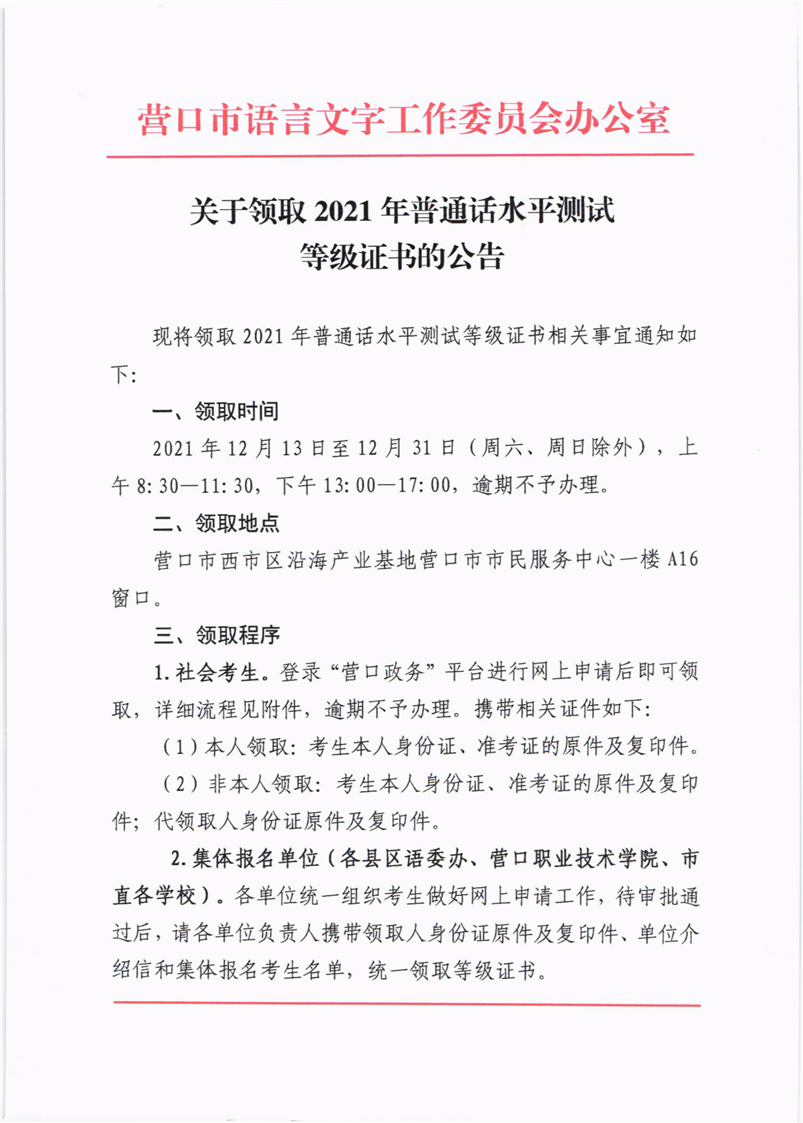 关于营口市领取2021年普通话水平测试等级证书的公告