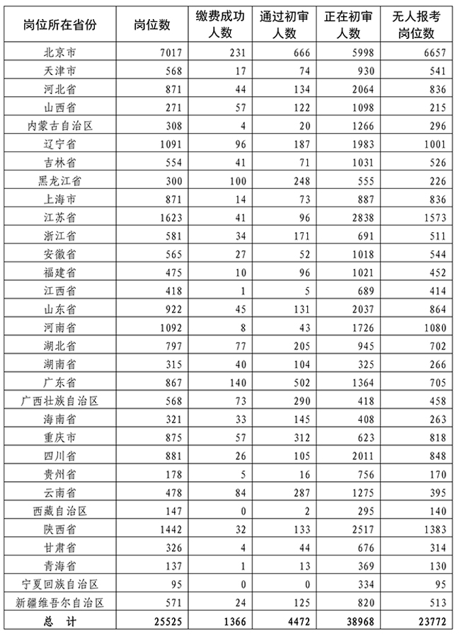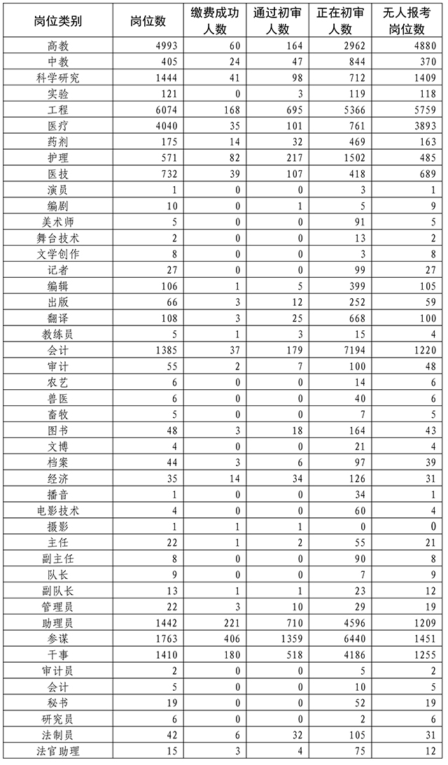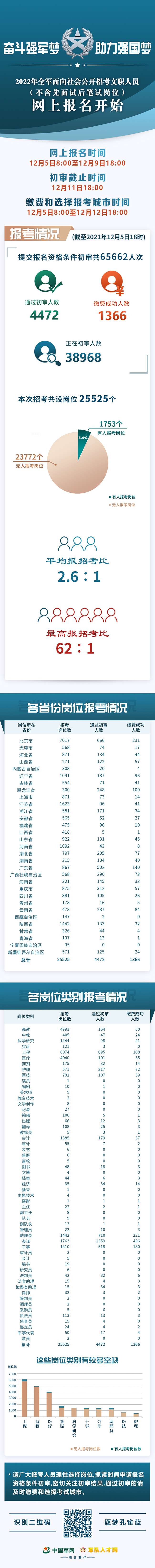 2022年全军面向社会公开招考文职人员(不含先面试后笔试岗位)网上报名于2021年12月5日8时正式开通。截至12月5日18时,提交报名资格条件初审共65662人次,通过报名资格条件初审的报考人员4472人,缴费成功的报考人员1366人,用人单位正在进行报名资格条件初审的报考人员38968人。有人报考的岗位1753个、占6.9%,平均报招考比为2.6∶1,最高报招考比为62∶1。此次招考网上报名时间为2021年12月5日8:00至9日18:00,报名资格条件初审截止时间为12月11日18:00,缴费和选择报考城市时间为12月5日8:00至12日18:00。请广大报考人员理性选择岗位,抓紧时间申请报名资格条件初审,密切关注初审结果,通过初审的请及时缴费和选择考试城市。相关招考岗位报考情况如下: