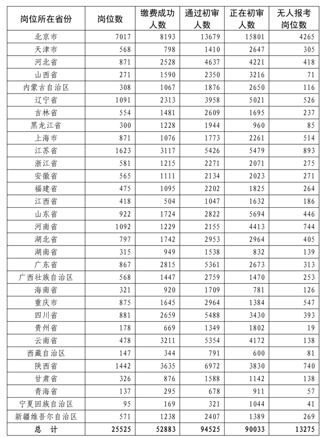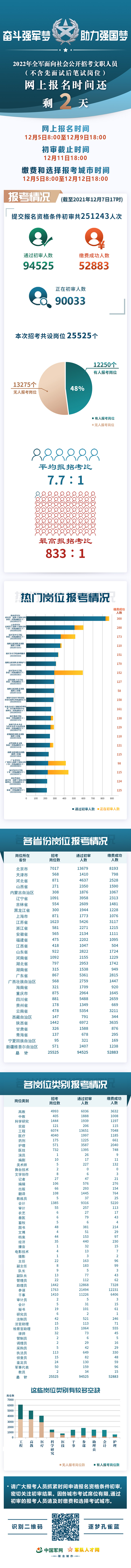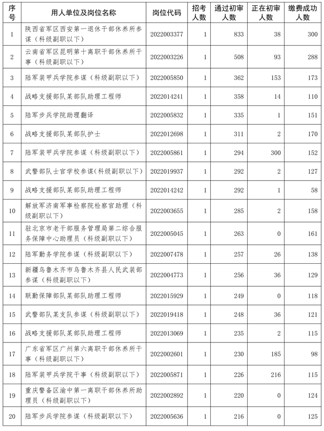 2022年全军面向社会公开招考文职人员(不含先面试后笔试岗位)网上报名火热进行中。截至12月7日17时,提交报名资格条件初审共251243人次,通过报名资格条件初审的报考人员94525人,缴费成功的报考人员52883人,用人单位正在进行报名资格条件初审的报考人员90033人。有人报考的岗位12250个、占47.99%,平均报招考比为7.7:1,最高报招考比为833:1。此次招考网上报名时间还剩2天,请广大报考人员抓紧时间申请报名资格条件初审,密切关注初审结果。因各城市考试席位有限,通过初审的报考人员请及时缴费和选择考试城市。相关招考岗位报考情况如下: