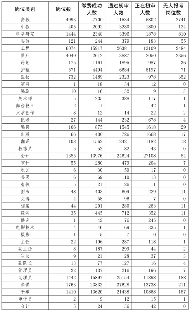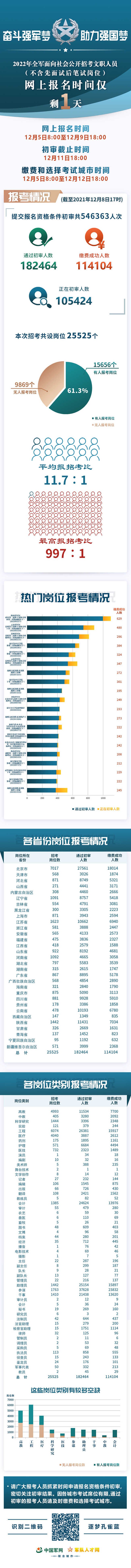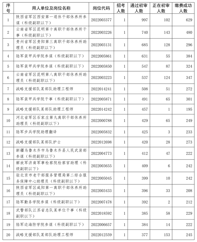 2022年全军面向社会公开招考文职人员(不含先面试后笔试岗位)网上报名火热进行中。截至12月8日17时,提交报名资格条件初审共546363人次,通过网上报名资格条件初审的报考人员182464人,缴费成功的报考人员114104名,用人单位正在进行报名资格条件初审的报考人员105424人。有人报考的岗位15656个、占61.3%,平均报招考比为11.7:1,最高报招考比为997:1。此次招考网上报名时间还剩最后1天,请广大报考人员抓紧时间申请报名资格条件初审,密切关注初审结果。因各城市考试席位有限,通过初审的报考人员请及时缴费和选择考试城市。相关招考岗位报考情况如下: