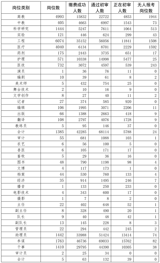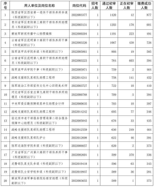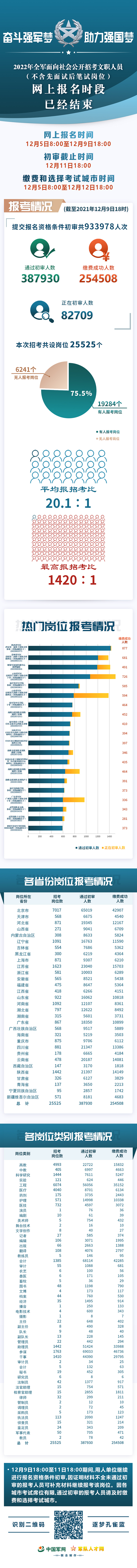 2022年全军面向社会公开招考文职人员(不含先面试后笔试岗位)报名时段已经结束。截至12月9日18时,提交报名资格条件初审共933978人次,通过初审的报考人员387930人,缴费成功的报考人员254508名,用人单位正在进行初审的报考人员82709人。有人报考的岗位19284个、占75.5%,平均报招考比为20.1:1,最高报招考比为1420:1。12月9日18:00至11日18:00期间,用人单位继续进行报名资格条件初审,因证明材料不全未通过初审的报考人员可补充材料继续报考该岗位。因各城市考试席位有限,通过初审的报考人员请及时缴费和选择考试城市。
