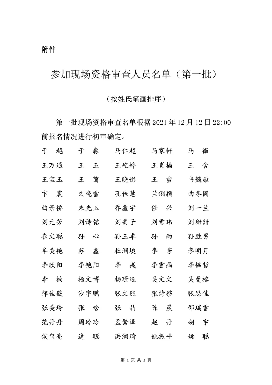 参加现场资格审查名单(第二批)公布时间:12月15日(周三)晚(未通过初审者不再另行通知)现场确认审查时须提供以下材料: