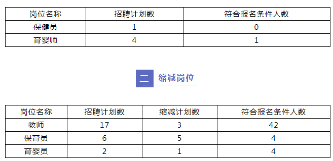 按照《2021年大连金普新区金牌园幼儿园招聘公告》要求,部分岗位报名人数与计划招聘人数未达到3:1比例,对未形成竞争比例的岗位予以取消或缩减,具体公告如下: