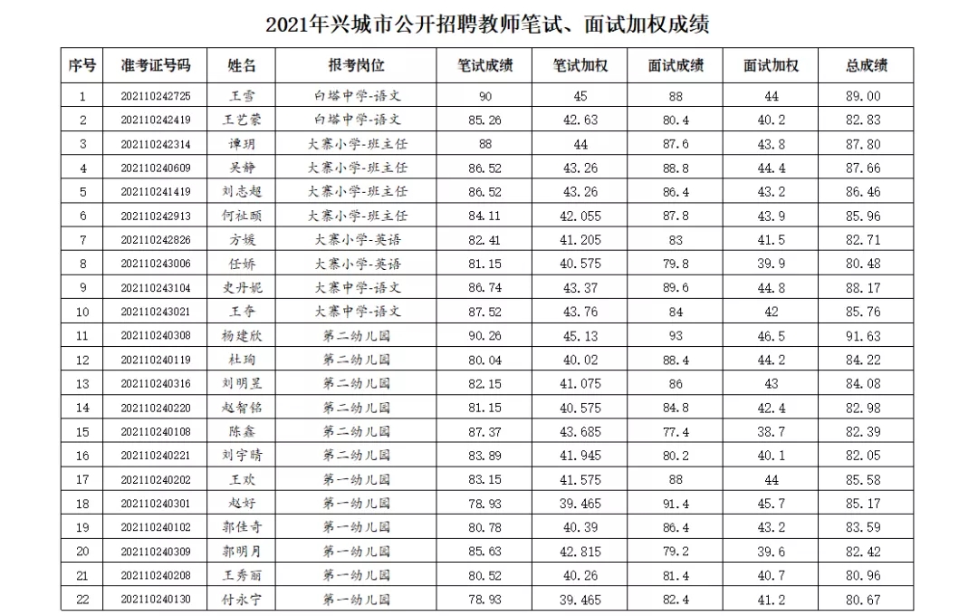 根据《2021年兴城市公开招聘教师公告》精神,现将笔试、面试加权总成绩公示如下。