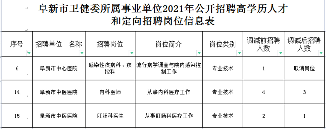 根据《阜新市卫健委所属事业单位2021年公开招聘工作人员及高学历人才公告》,因符合条件报名人员不足,将部分高学历人才岗位予以取消或者调减岗位招聘数量,详见下表,特此公告。