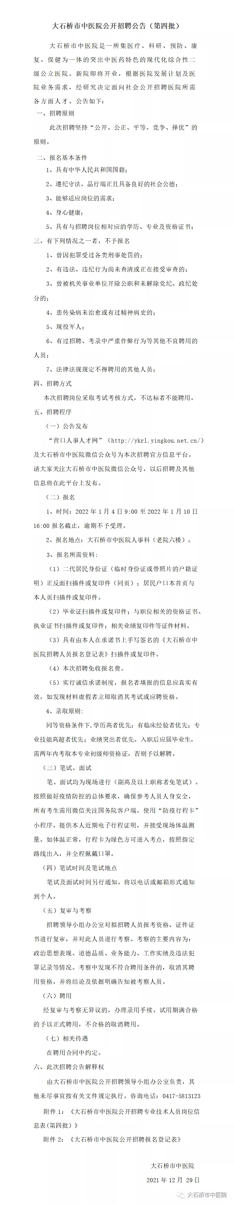 营口大石桥市中医院公开招聘公告(第四批)