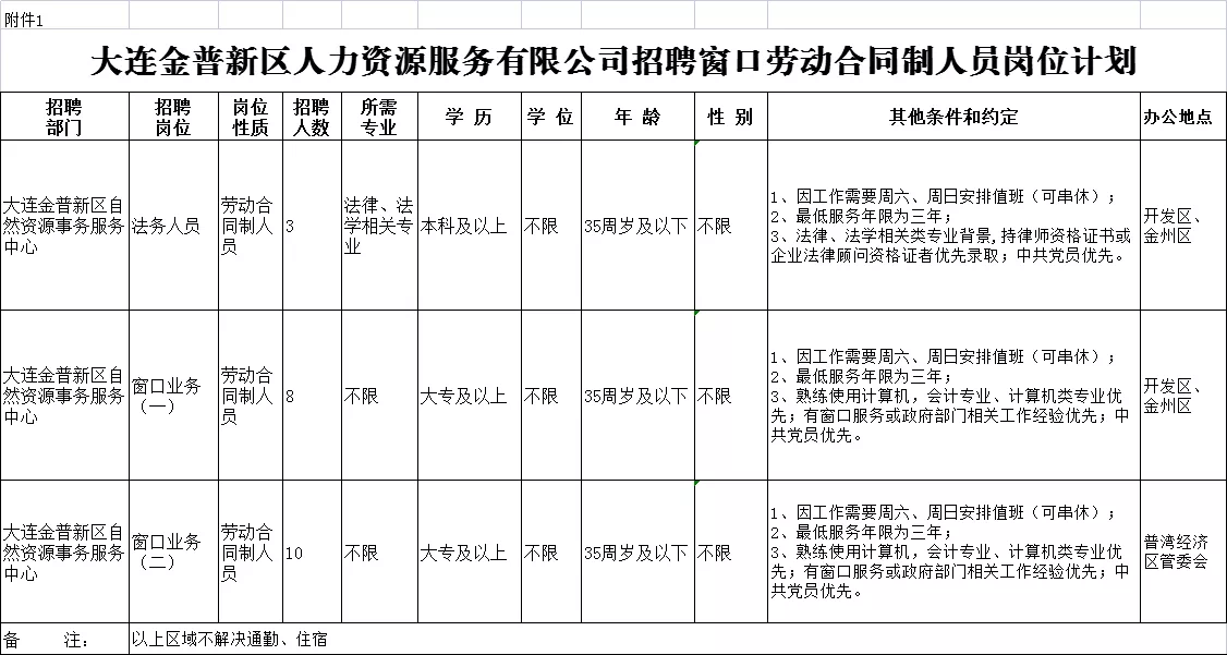 附件1: 《大连金普新区人力资源服务有限公司招聘窗口劳动合同制人员岗位计划》