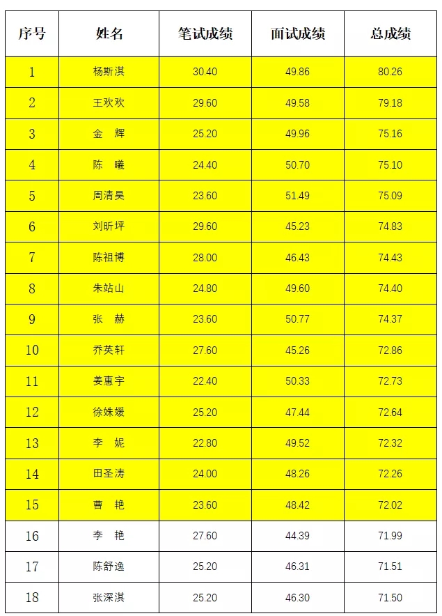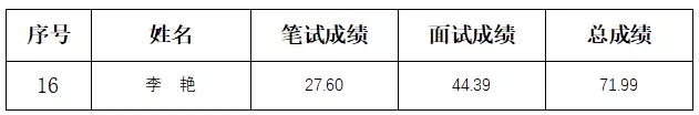 黄色区域为确定进入体检和考察人选,(详情见1月12日“鞍山市人力资源服务协会(www.ashra.org.cn)”官方微信公众号)。因第13名李妮个人原因自愿放弃此次拟录用资格,出现的岗位空缺,按照总成绩从高分到低分的顺序依次进行递补。因此第16名李艳为递补后拟录用人员。