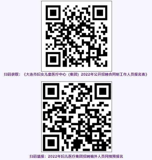 ⑴《大连市妇女儿童医疗中心(集团)2022年公开招聘合同制工作人员报名表》(详见下方二维码),填写并A4纸打印,本人签字后上传;
