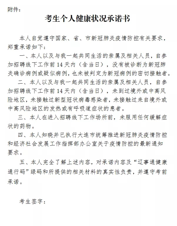 为安全有序开展招聘工作,考生应通过“大连发布”微信公众号或登录大连市人民政府网站“全力做好新型冠状病毒肺炎疫情防控工作”专栏,了解大连市统筹推进新冠肺炎疫情防控和经济社会发展工作指挥部关于疫情防控的最新通知要求,提前下载“辽事通”APP或微信小程序,登录并进行实名认证,申领“辽事通健康通行码”。所有考生在进入招聘线下工作场所时,应主动出示“辽事通健康通行码”,接受体温检测,并自备一次性医用口罩。确定为绿码、经体温检测不高于37.3℃方可进入。体温超过37.3℃的,需现场进行1次体温复测。复测后仍超过37.3°C的考生,应提供面试日前48小时内核酸检测阴性证明和三级甲等医院出具的排除新冠肺炎的诊断意见,否则不得参加线下招聘。在候考过程中出现发热、咳嗽等异常症状的考生,应及时向工作人员进行报告,按照工作人员引导,转移至备用隔离候考室,如经综合研判不具备继续参加相关招聘工作条件的考生,按照疫情防控要求进行转移,不再进行补考。